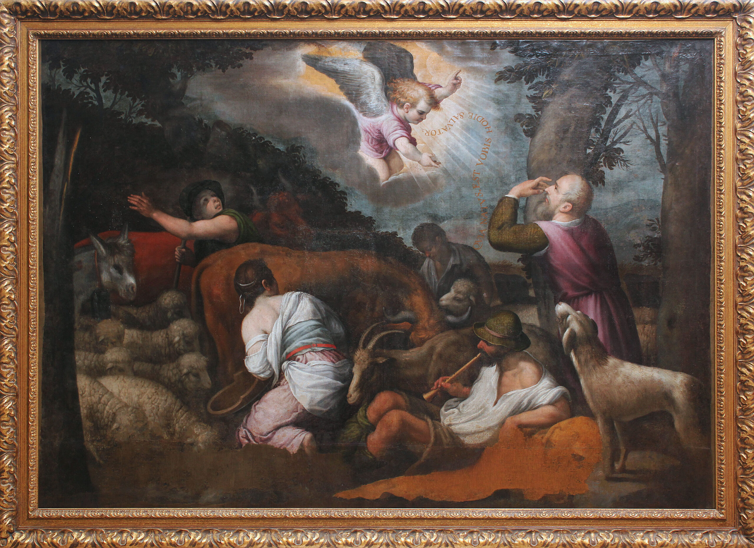 El resto de los pastores muestran actitudes diversas ante el prodigio: uno permanece ajeno tocando una flauta, otro se arrodilla con un cubo de ordeño en la mano, y otros levantan la mirada con sorpresa o asombro. El grupo se completa con un variado rebaño —ovejas, cabra, vaca, buey y una mula— que aporta naturalismo y riqueza narrativa.